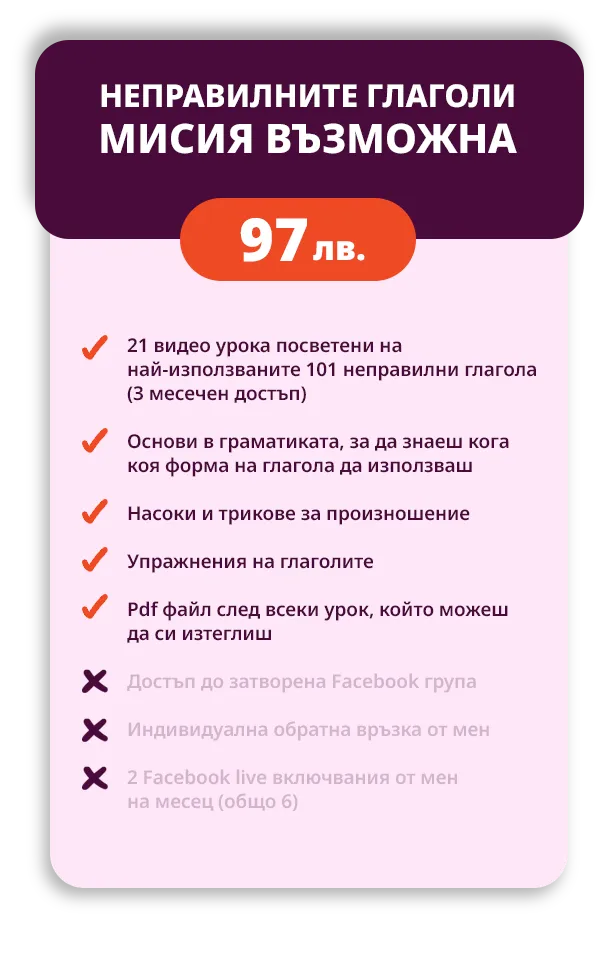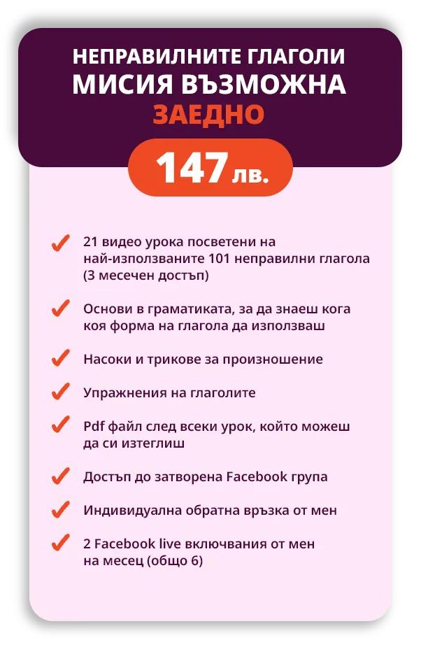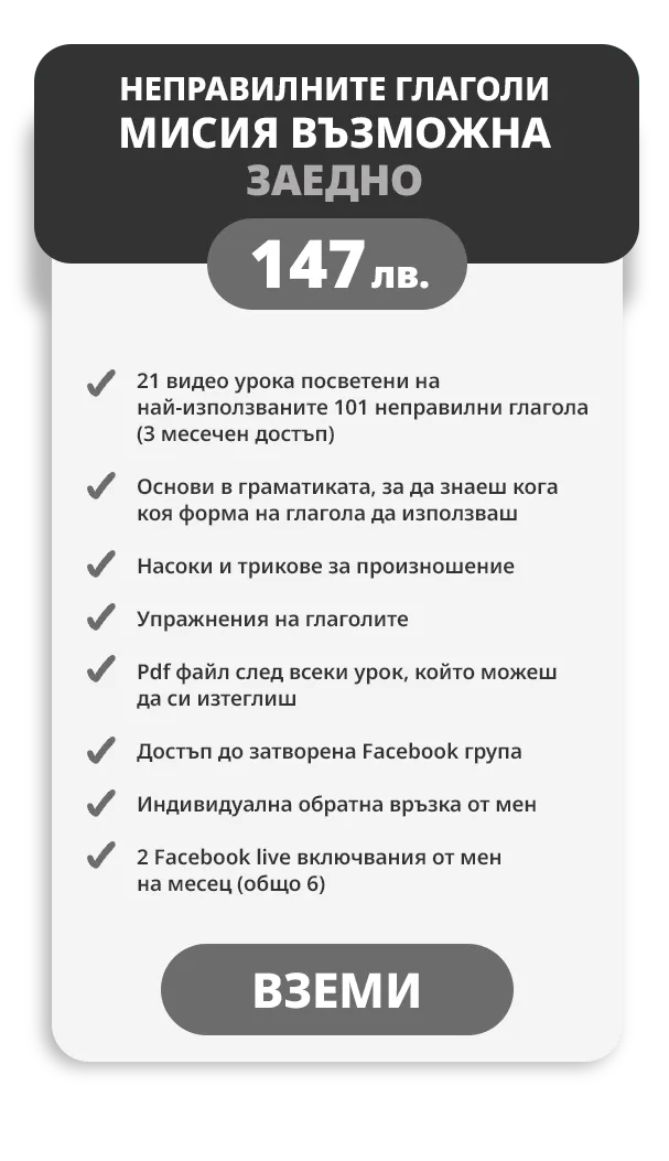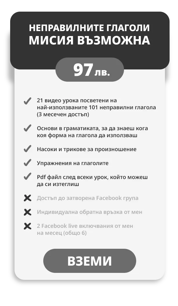 Включи се в курса НЕправилните глаголи - мисия ВЪЗМОЖНА! и започни покоряването на най-използваните 101 неправилни глаголи в английския език!